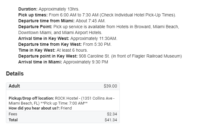 Osobiście polecam firmę „Travel to Key West”; o 6.00 kierowca odbiera posiadających bilet bezpośrednio spod najbardziej popularnych (co nie znaczy, że najdroższych!) hoteli w Miami Beach. Planowo autobus dociera na wyspę ok. 11.30, a w wyznaczonym do zbiórki miejscu należy stawić się powtórnie o 17.30. Czas na zwiedzanie i opalanie wynosi więc 6 godzin, co daje wystarczająco dużo czasu, żeby zobaczyć najważniejsze punkty na wyspie, zjeść obiad i chwilę poplażować.
