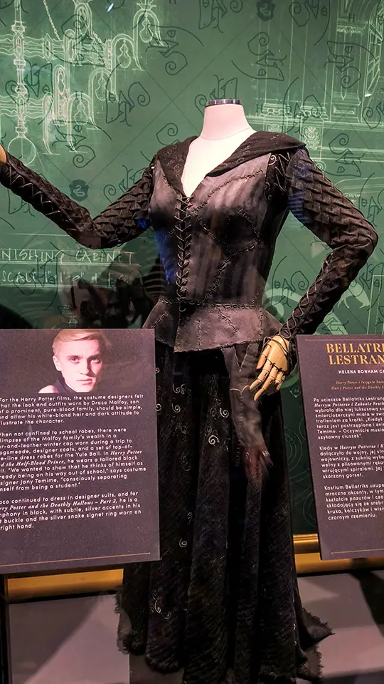 Dalej jest tylko lepiej. Ilość ciekawostek, faktów i informacji, które dostajemy w nagraniach audio oraz w opisach eksponatów jest przeogromna. I nie są to powszechnie znane wiadomości, bo nawet ja jako wielka potteromaniaczka ich nigdy nie słyszałam. Jeśli chodzi o eksponaty, to są to głównie rekwizyty używane podczas kręcenia filmów. Nie tylko mamy okazję zobaczyć je z bliska, ale również poznać niesamowite historie łączące się z ich powstaniem i wykorzystaniem. Muszę przyznać, że najdłużej przyglądałam się kostiumowi Śmierciożercy, bo na ekranie zazwyczaj spowijał ich mrok i niewiele było widać.